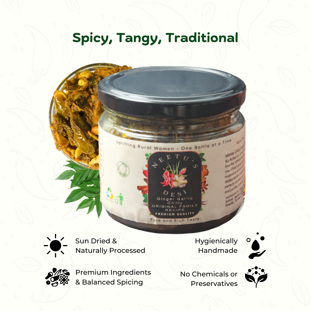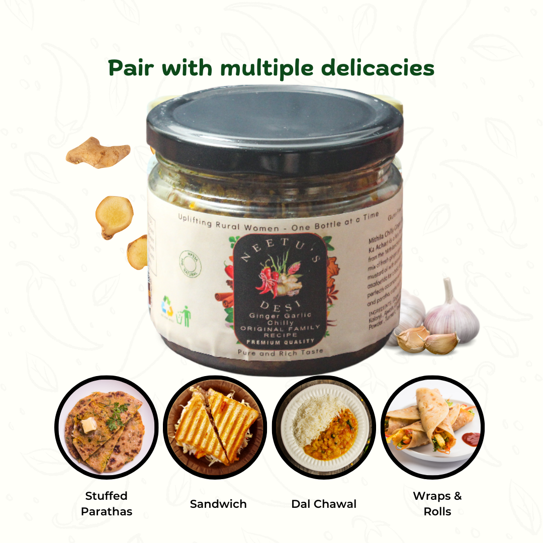 Why settle for one when you can enjoy all three? This fiery trio of garlic, ginger, and green chilli brings the perfect punch of spice to elevate any meal. Handcrafted in small batches, our pickles are made with utmost care, ensuring top-notch taste, hygiene, and quality. Every spoonful delivers that comforting, homemade goodness you crave.