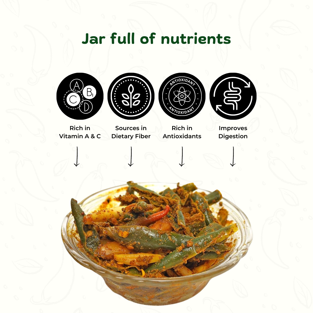 Bring home the authentic flavor of India with our Ginger Garlic Chilli Mixed Achar, a fiery combination of fresh garlic, aromatic ginger, and spicy green chillies. Made with pure mustard oil and handpicked spices, this pickle delivers the perfect balance of heat, tang, and desi goodness.