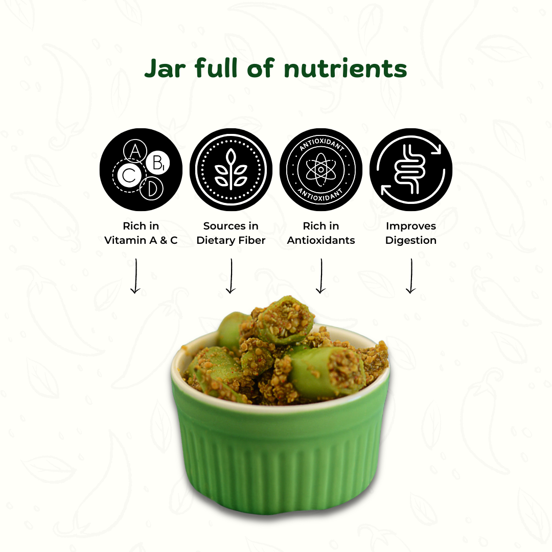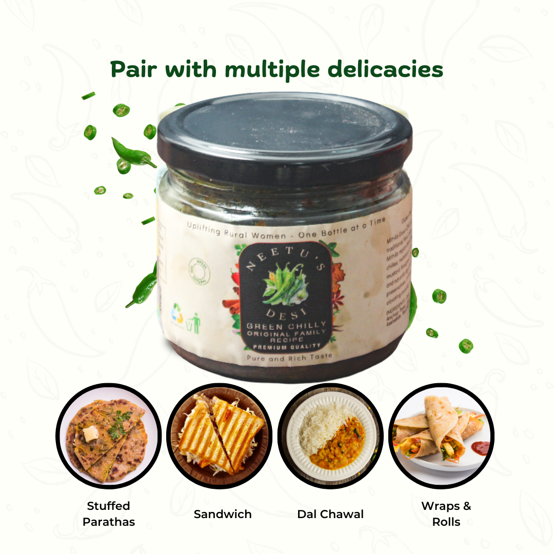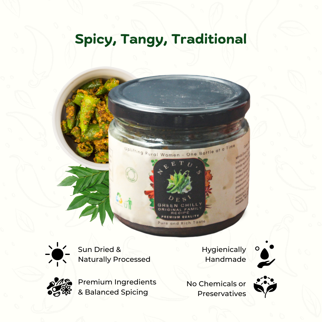Spice up your meals with our Green Chilli Stuffed Achar, a fiery and flavorful Indian pickle made from fresh green chillies stuffed with a rich blend of hand-ground spices and tangy mustard oil. Each bite delivers the perfect balance of heat, aroma, and traditional taste — just like homemade achar made by grandma. Crafted in small batches by skilled women artisans, this Mirchi Bharwa Achar brings the authentic desi flavor that turns every meal into a feast.