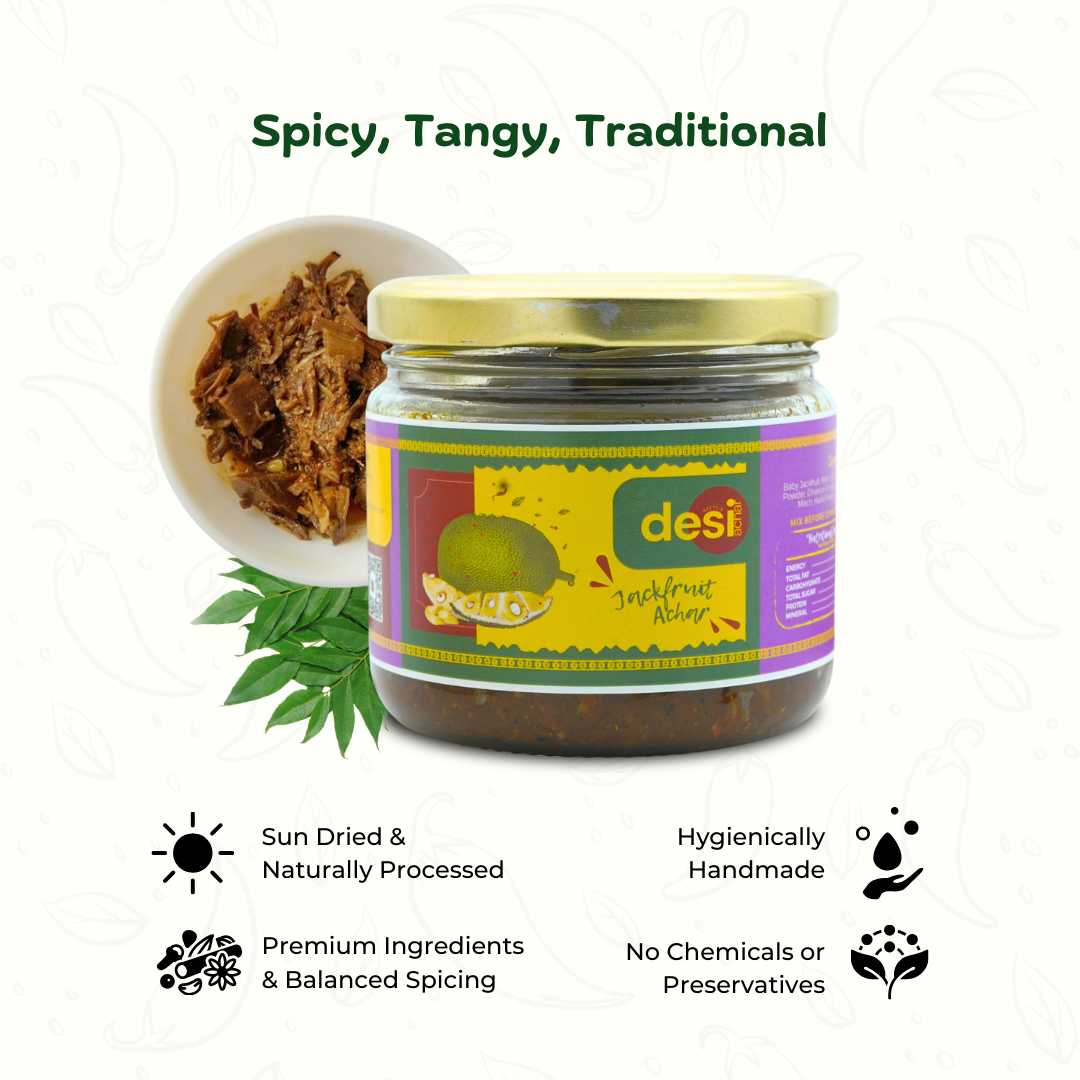 Description: Jackfruit Pickle uses a powerful blend of traditional ingredients like methi, ajwain, kalonji, mustard oil, and more. The nutrient-rich kathal is carefully cleaned, hand-cut, and mixed with aromatic spices, then sun-cured for days to soak in all the tangy flavors. Our pickle is handcrafted, fresh, zesty, and packed with nutrition—an ideal companion to your everyday meals. Just a spoonful is enough to elevate your plate!