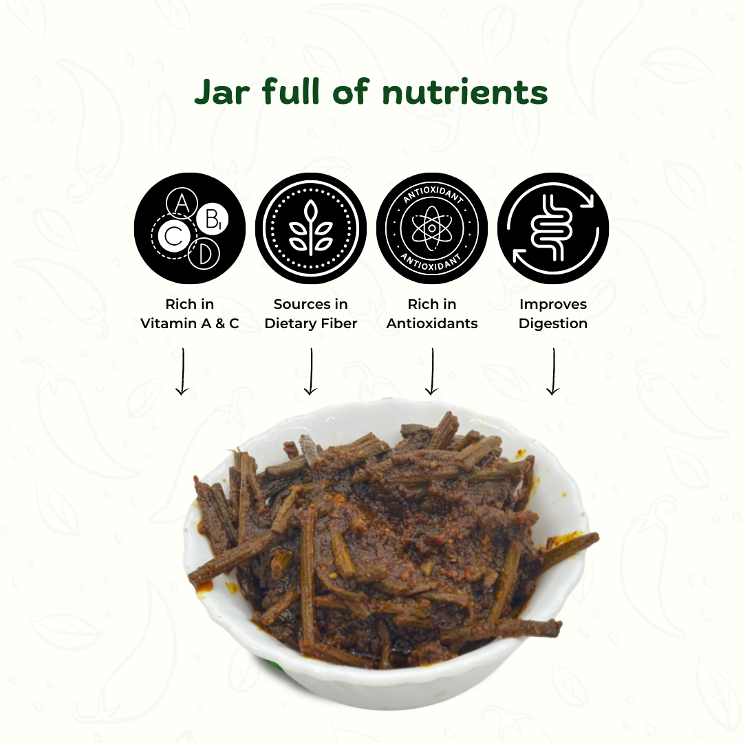 Our Moringa Achar is a unique blend of health and flavor, made from fresh moringa (drumstick) pods cooked in mustard oil and seasoned with traditional Indian spices. Tangy, spicy, and full of nutrients, this pickle not only enhances the taste of your meals but also adds a healthy twist with every bite. Handmade in small batches without preservatives, it brings the authentic homemade swad straight to your plate.